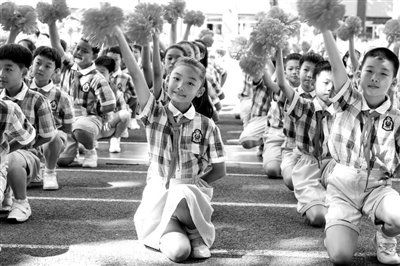 在河北省石家莊市東風西路小學陽光大課間體育活動中,五年級學生進行花球操表演。本報記者 單藝偉 攝