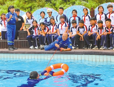6月26日,在河北省秦皇島市海港區(qū)王莊小學,藍天救援隊隊員為學生演示溺水救援。曹建雄 攝