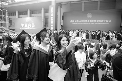 6月28日,重慶大學(xué)2025年畢業(yè)典禮暨學(xué)位授予儀式現(xiàn)場,學(xué)生合影留念。當(dāng)天,該校1.5萬名畢業(yè)生懷揣對未來的憧憬和期望,即將踏上人生新的征程。重慶大學(xué)校長王樹新以“堅(jiān)韌”為題,為全體畢業(yè)生帶來一堂“青春揚(yáng)帆新時(shí)代”的畢業(yè)課程。