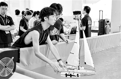 在由江蘇科技大學舉辦的第十三屆全國海洋航行器設計與制作大賽暨首屆船舶與海洋工程類教師教學創新大賽上,參賽隊員對航行器進行調整。 江蘇科技大學供圖 (資料圖片)
