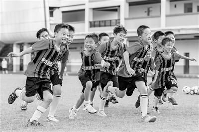 ①浙江省杭州市安吉路教育集團學生在踢足球。