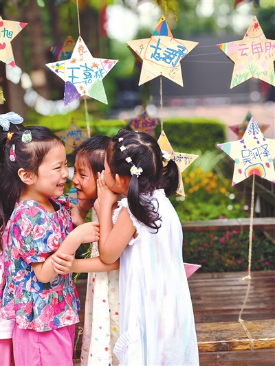 日前,中華女子學院附屬實驗幼兒園舉行了主題為“最好的未來”的畢業典禮。活動中,孩子、教師和家長們用音樂、舞蹈、視頻,致敬孩子、致敬家長、致敬教師和園長,飽含祝福和希冀。圖為孩子們在親手繪制的星星簽名墻前互相擁抱、祝福。 鄭嵐吉 攝