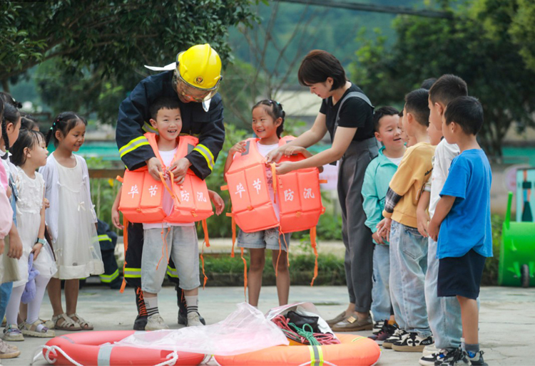 近日,在貴州省黔西市永燊彝族苗族鄉火石壩村,消防人員指導學生穿救生衣。周訓超 攝