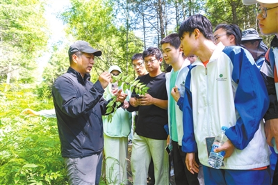 7月15日,在實習現場,東北林業大學林學院教授王秀偉(左一)教學生辨認植物形態特征。