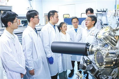 中國科學院院士、南方科技大學校長薛其坤(右一)和團隊成員在實驗室。