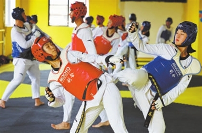 近日,在山東省棗莊市,孩子們在練習跆拳道。 孫中喆 攝