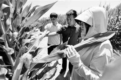 當日,鑫源農機農民專業合作社理事長趙剛(中)向大學生們介紹玉米生長情況。