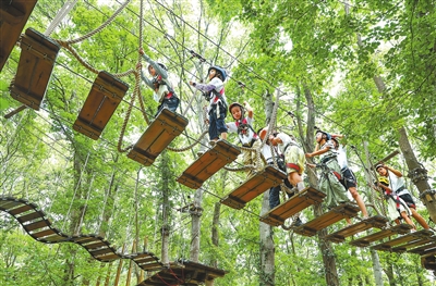 正值暑期,孩子們在親近自然中鍛煉身心,收獲成長與快樂。圖為7月26日,孩子們在江蘇連云港市楓樹灣叢林樂園體驗空中探險。新華社發