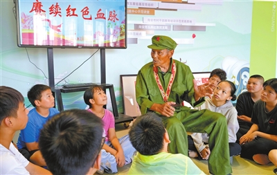 7月31日,在江蘇省海安市墩頭鎮的公益暑托班上,95歲高齡的老兵謝鳳如向學生們講述紅色故事。周強 丁春梅 攝