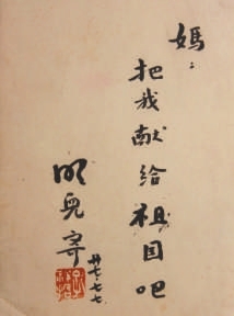1938年6月,19歲的孔邁瞞過(guò)父母,為抗戰(zhàn)北上。途經(jīng)香港時(shí),他用即將到來(lái)的“七七事變”一周年紀(jì)念日作為落款時(shí)間,并以母親對(duì)自己的愛(ài)稱“明兒”署名,在一張7寸黑白相片背面寫(xiě)下:“媽:把我獻(xiàn)給祖國(guó)吧。”他托人將相片轉(zhuǎn)交給尚在蘇門答臘島的父母。