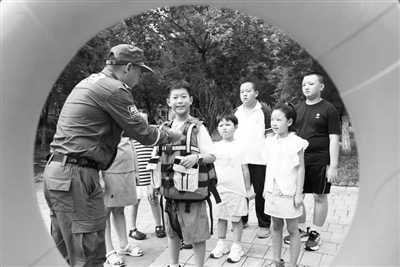 在河北省唐山市豐潤區(qū)燕山路街道陽光社區(qū),藍(lán)天救援隊(duì)隊(duì)員給孩子們講解救生衣的使用方法。朱大勇 攝