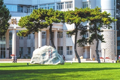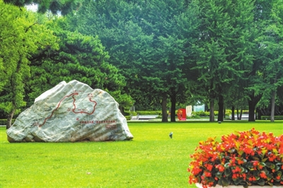 綠樹掩映,陽光明媚。在北京理工大學中心花園,一座產(chǎn)自延安的景觀石靜臥于茵茵草坪之上。這座高3.6米的石刻花崗巖,名為“延安精神”石。遠觀似黃土高坡群山疊嶂、黃河奔涌、雄渾豪邁,近看綠意盎然、阡陌縱橫、賞心悅目,石上刻著“延安精神 薪火相傳”8個大字。