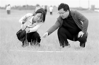 8月21日,陜西省定邊縣白泥井鎮大水村的一片鹽堿地里,西北農林科技大學副研究員李偉正在給張夢婕(左)講解植物群落調查的方法。