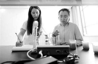8月21日,陜西省定邊縣生態氣象聯合實驗室里,張夢婕(右)在西北農林大學博士生指導下進行土壤理化特性測定。靳軍 本報記者 張學軍 攝