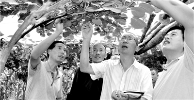 西北農(nóng)林科技大學(xué)獼猴桃試驗(yàn)示范站首席科學(xué)家劉占德(右二)在農(nóng)戶(hù)果園里查看果樹(shù)生長(zhǎng)情況。 西北農(nóng)林科技大學(xué) 供圖