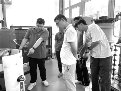 企業(yè)工程師(左一)為南華大學(xué)電氣工程學(xué)院研究團(tuán)隊(duì)現(xiàn)場(chǎng)講解機(jī)械原理。 學(xué)校供圖