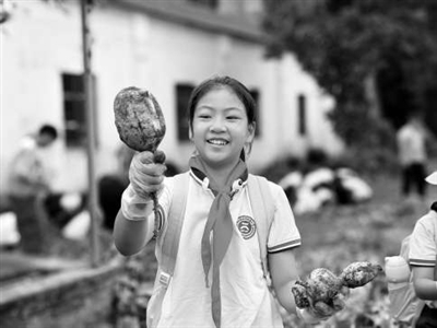 浙江省嵊州市逸夫小學寄宿學生采摘自己種植的果實。 學校供圖