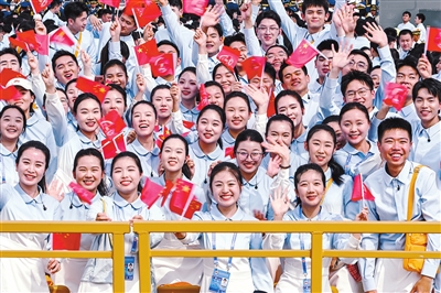 9月3日,紀念中國人民抗日戰爭暨世界反法西斯戰爭勝利80周年大會在北京隆重舉行。這是合唱團成員揮舞旗幟。 新華社記者 李安 攝
