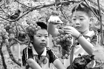 九月一日,浙江省湖州市長興縣呂山鄉中心小學校外勞動實踐基地里,學生們正在采摘葡萄。 通訊員 周洪峰 攝