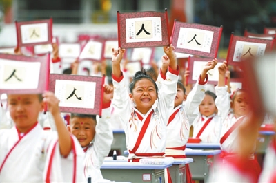 9月5日,貴州省黔東南苗族侗族自治州黃平縣新州鎮中心小學一年級新生展示自己剛剛寫好的“人”字。當日,學校一年級新生身著儒生禮服參加“開筆禮”。通過莊重的“起筆描紅”“行拜師禮”等儀式,勉勵新生珍惜讀書機會、勤奮學習,扣好人生“第一粒扣子”。 梁文 攝