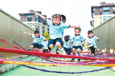 近日,浙江省長興縣龍山街道中心幼兒園的孩子們在進行跳皮筋游戲,體驗運動樂趣。該園開展“樂享運動”主題活動,讓孩子們通過滾“風(fēng)火輪”、擲流星球等特色體育運動,享受運動帶來的快樂。吳拯 攝