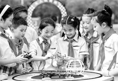 9月8日,江蘇省海安市城南實(shí)驗(yàn)小學(xué)學(xué)生在了解無(wú)人機(jī)性能。近年來(lái),該校將無(wú)人機(jī)、機(jī)器人等科技創(chuàng)新元素融入學(xué)校第二課堂,培養(yǎng)學(xué)生對(duì)科學(xué)技術(shù)的興趣和愛(ài)好,零距離感受科技魅力。