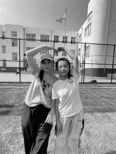③足球場(chǎng)上,教師李丹與學(xué)生馬欣彤并肩比心。資料圖片