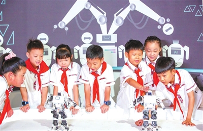 南屏小學的學生在海安市科技館觀看智能機器人表演。