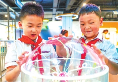 南屏小學的學生在海安市科技館體驗科普小裝置。