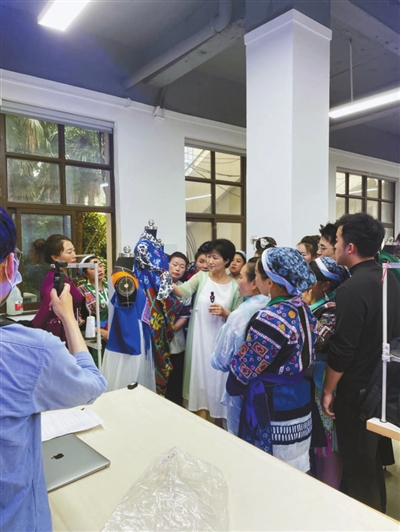 張順愛為研培班學(xué)員講解結(jié)對(duì)設(shè)計(jì)作品。 東華大學(xué)供圖