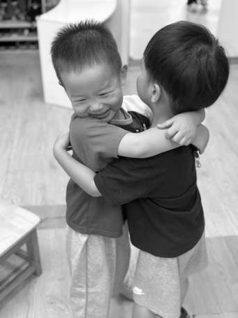 最讓幼兒期待的,還是每天的“抱抱時間”。輕柔的音樂響起,教師說:“現在是抱抱時間,如果你想和誰交朋友,就去抱抱他。”總有些靦腆的幼兒不好意思,我們會先擁抱愿意的幼兒,再引導他們互相擁抱。思予因為想媽媽還在哭泣,沛沛看到后,主動去擁抱她,思予慢慢平靜了下來。