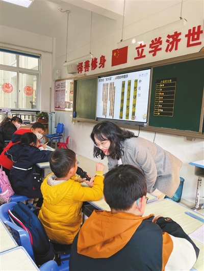 安徽大學教師白琳為合肥一六八玫瑰園學校小學一年級學生授課。