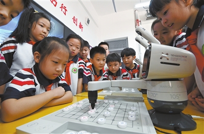 近日,河北省邯鄲市邯山區(qū)農(nóng)林路小學學生與AI棋類機器人對弈。秋季新學期,該校引入兩臺AI棋類機器人擔任“AI陪練員”。學生們可與AI棋類機器人對弈多種棋類,直觀感受人工智能的魅力。 郝群英 攝