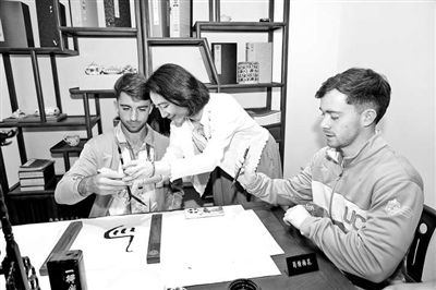 ②外國運動員體驗漢字書法,領略中華優秀傳統文化魅力。 賽事組委會供圖
