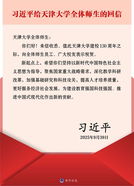 近日,中共中央總書記、國家主席、中央軍委主席習近平給天津大學全體師生回信,在天津大學建校130周年之際,向全體師生員工、廣大校友表示祝賀。