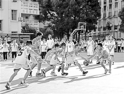 貴州省黔東南苗族侗族自治州凱里市第四小學學生在進行籃球比賽。 蔡興文 攝