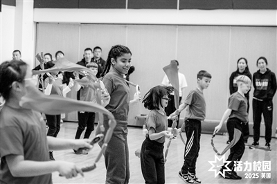 為了確保課堂安全,施海紅先讓學生們使用無線跳繩器材——兩個帶紅綢緞的手柄。等他們掌握了基本跳繩動作后,再改用有線跳繩器材。半小時的體育課結束時,學生們不僅全部學會了跳繩,還能做出一些花樣動作。當他們一起熟練地跳動時,旁邊觀摩的兩名體育教師也情不自禁加入其中。“顯然,大家都很享受這堂體育課。”一名柯文小學的教師說。