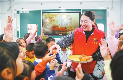 10月21日,在江蘇省如皋市白蒲鎮(zhèn)蒲西小學(xué),志愿者帶領(lǐng)學(xué)生近距離觀察柿子。當(dāng)日,該校開展“迎霜降節(jié)氣 學(xué)民俗知識(shí)”主題活動(dòng),通過朗誦相關(guān)古詩歌、賞菊花等形式,向?qū)W生普及節(jié)氣知識(shí)和民間習(xí)俗。徐慧 攝
