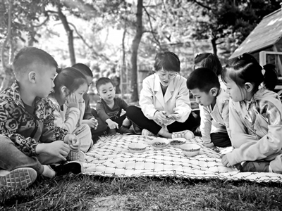 保育員王淑紅原來在服裝廠工作,懂裁剪技術(shù)。一次,教師李敏參加青年教師基本功大賽,需要沙包教具。為讓布料、大小規(guī)格更加合適,王淑紅參與到了教學(xué)現(xiàn)場中來。了解教師的要求后,她連夜縫制了20個(gè)沙包,保證了第二天的教學(xué)活動順利完成。就這樣,保育員把傳統(tǒng)手藝變成教育手段,和專任教師一同站在了教學(xué)現(xiàn)場。