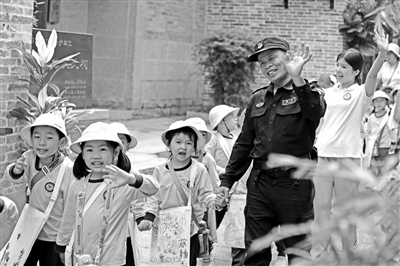入園時(shí),保安與民警、志愿者一同迎接幼兒。遇到情緒低落的幼兒,他們會主動迎上、抱進(jìn)園內(nèi)。離園時(shí),保安與幼兒互道再見,完成溫馨的離園儀式。他們更是有心的觀察者:一次,有家長隨手丟果皮,一名幼兒主動撿起扔進(jìn)垃圾桶。保安立刻表揚(yáng)幼兒,并倡議家長“向幼兒學(xué)習(xí)”。