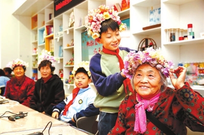 10月27日,江蘇省連云港市連云區,學生給老人戴上簪花發箍。當日,連云區墟溝街道桃園社區聯合東港小學開展民俗文化體驗活動,讓小學生和老人共同迎接重陽節。 朱華南 攝