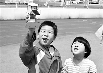 ①一對(duì)小兄妹測(cè)試太陽能衛(wèi)星模型。