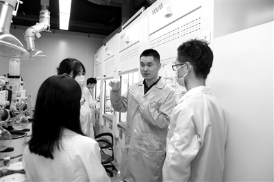 圖為深職大特聘教授滕超與團隊成員在實驗室探討材料配方方案。 學校供圖