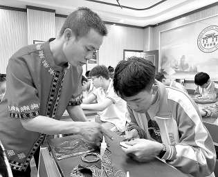 海南中學白沙學校學生在非遺傳承人指導下制作黎錦冰箱貼。王柳蕓 攝