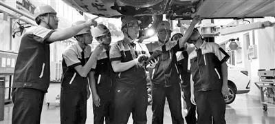 學生在企業師傅指導下探究汽車零部件檢測流程。