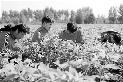 長春職業技術大學現代農業專業學生在中科院地理所大豆實驗田實習人工授粉。