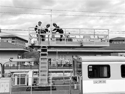 吉林鐵道職業技術大學鐵道供電技術專業學生在接觸網檢修作業車的檢修平臺上進行更換整體吊弦作業。