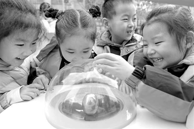 陜西省渭南市臨渭區蘇園豐景幼兒園,孩子們體驗科普大篷車項目“旋轉的銀蛋”。通訊員 崔正博 攝