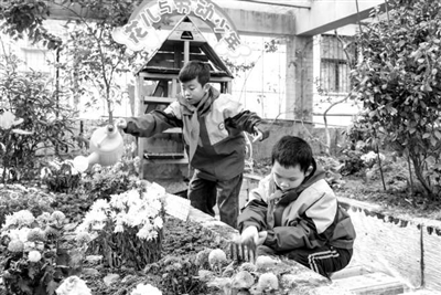 在湖北省襄陽市松鶴路小學教學樓頂的“空中花園”里,學生們在教師指導下養護盛放的菊花。 李旭暉 攝
