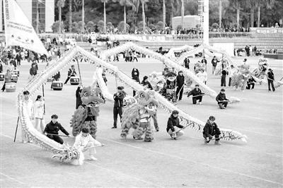 泉州輕工職業學院第九屆運動習慣比試大會彩排現場,學生正在進行非遺舞龍展示。 謝貴明 攝